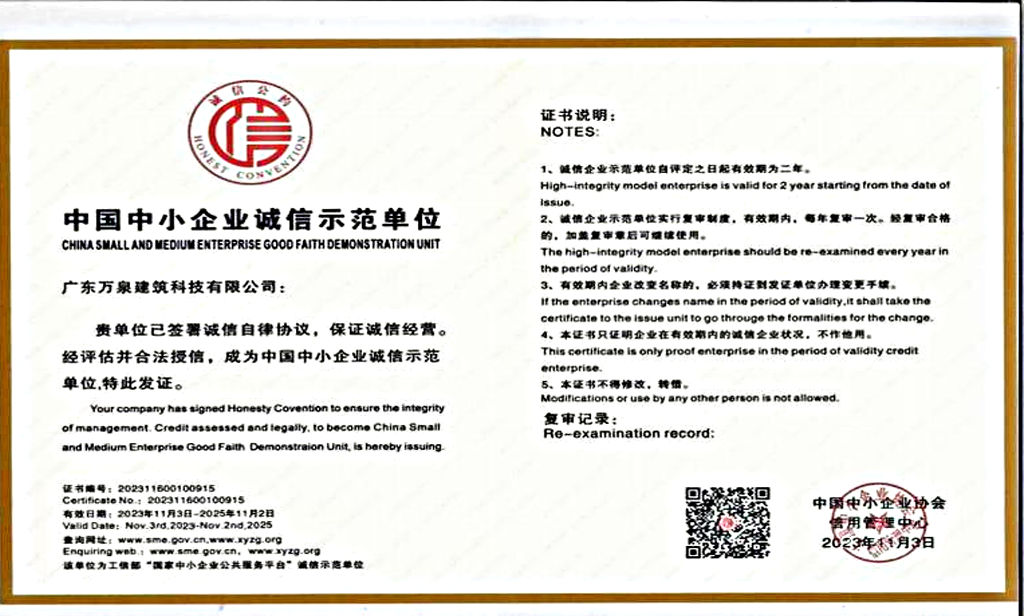 National Recognition! Guangdong Wanquan Honored as "China SME Integrity Demonstration Unit", Driving Growth with Trust.