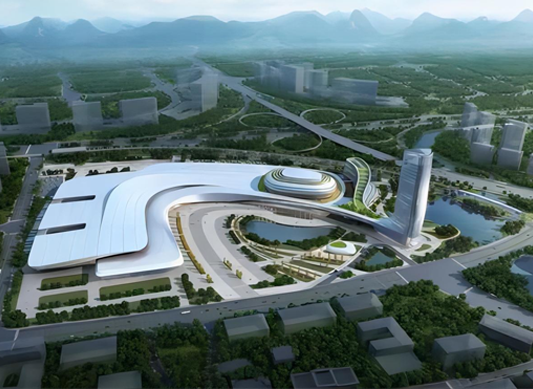 桂林国际会展中心气势恢宏,是桂林市标志性建筑, 位于素有百里画廊之称的漓江   之滨,占地 15 万平方米,建筑总面积 5.28 万平方米